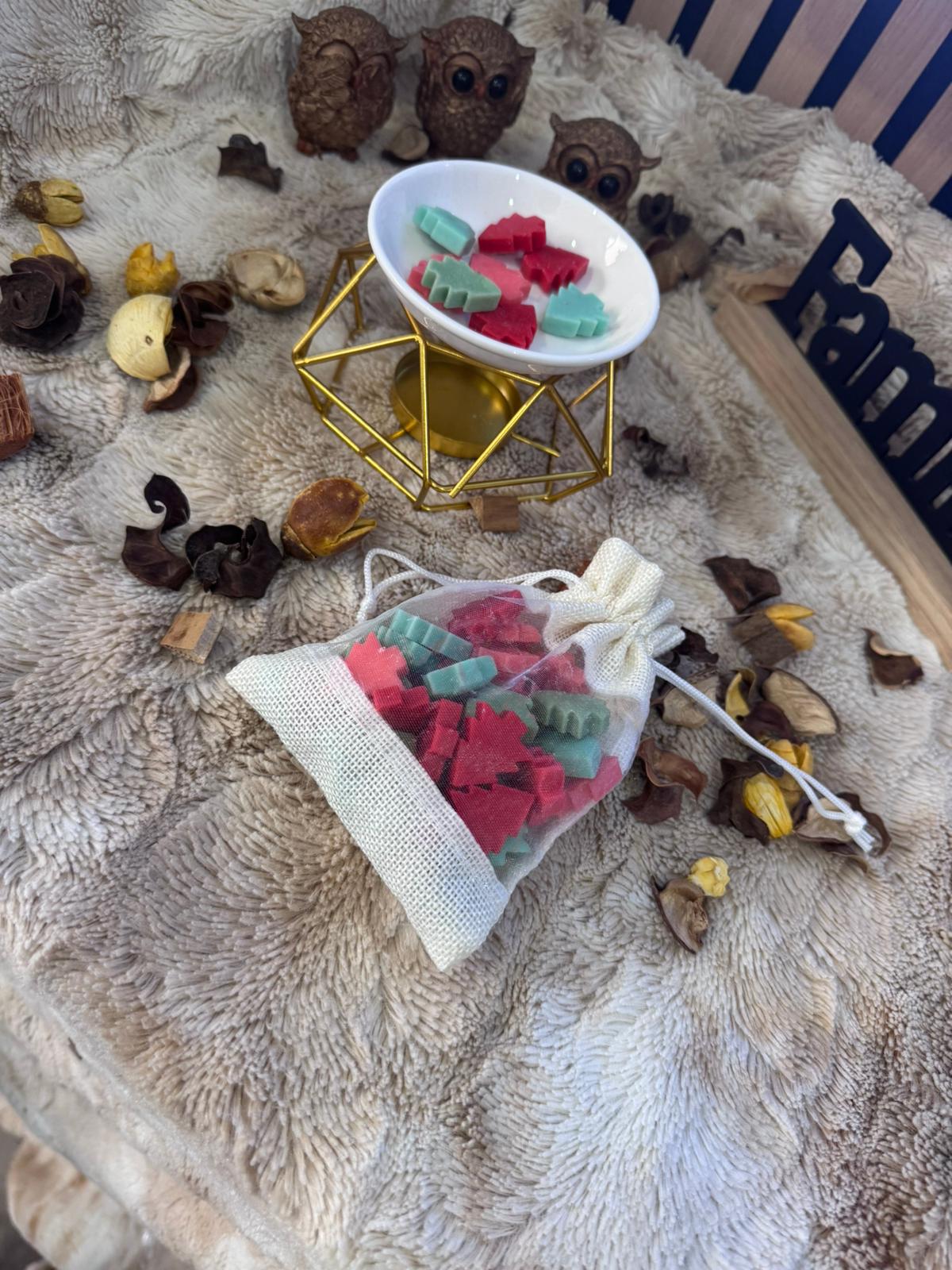 O kit inclui 1 saquinho de wax melts aromáticos em formas natalinas e 1 peça (suporte para derreter), ideal para criar um ambiente acolhedor e cheio de aroma festivo.